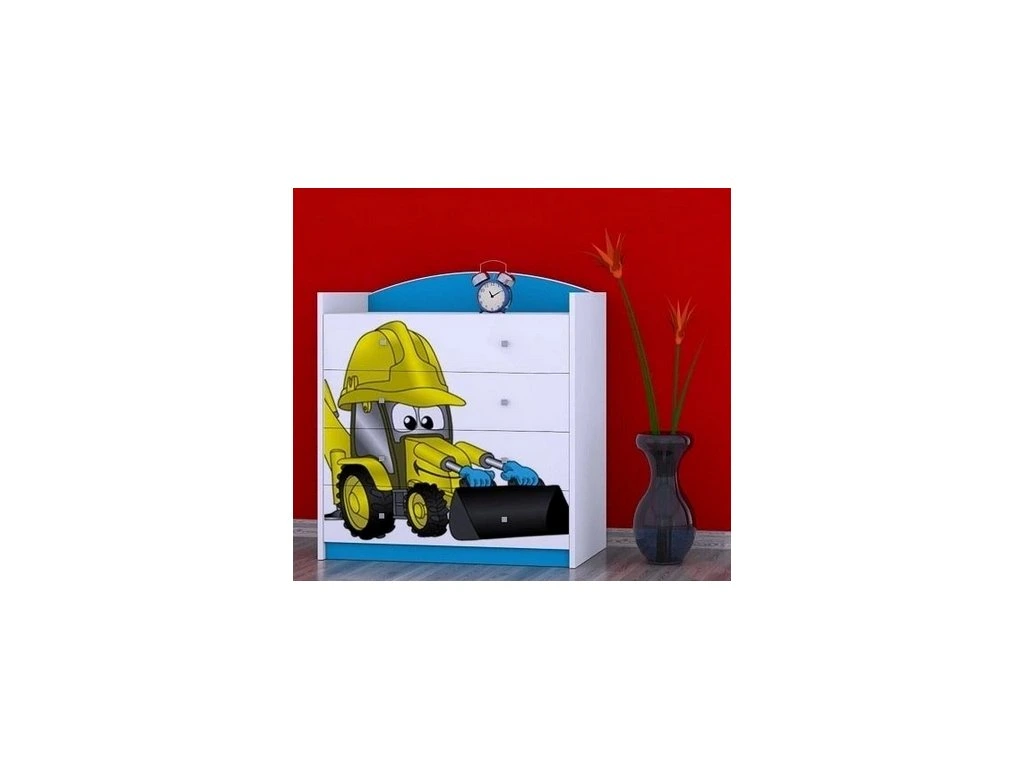 Potřebujete v klučičím pokoji nastolit řád? Naše dětská komoda s motivem bagru je tím pravým „těžkým strojem“ pro úklid. Čtyři prostorné zásuvky hravě pojmou veškerou výbavu malého objevitele – od triček až po ty největší poklady ze světa techniky.