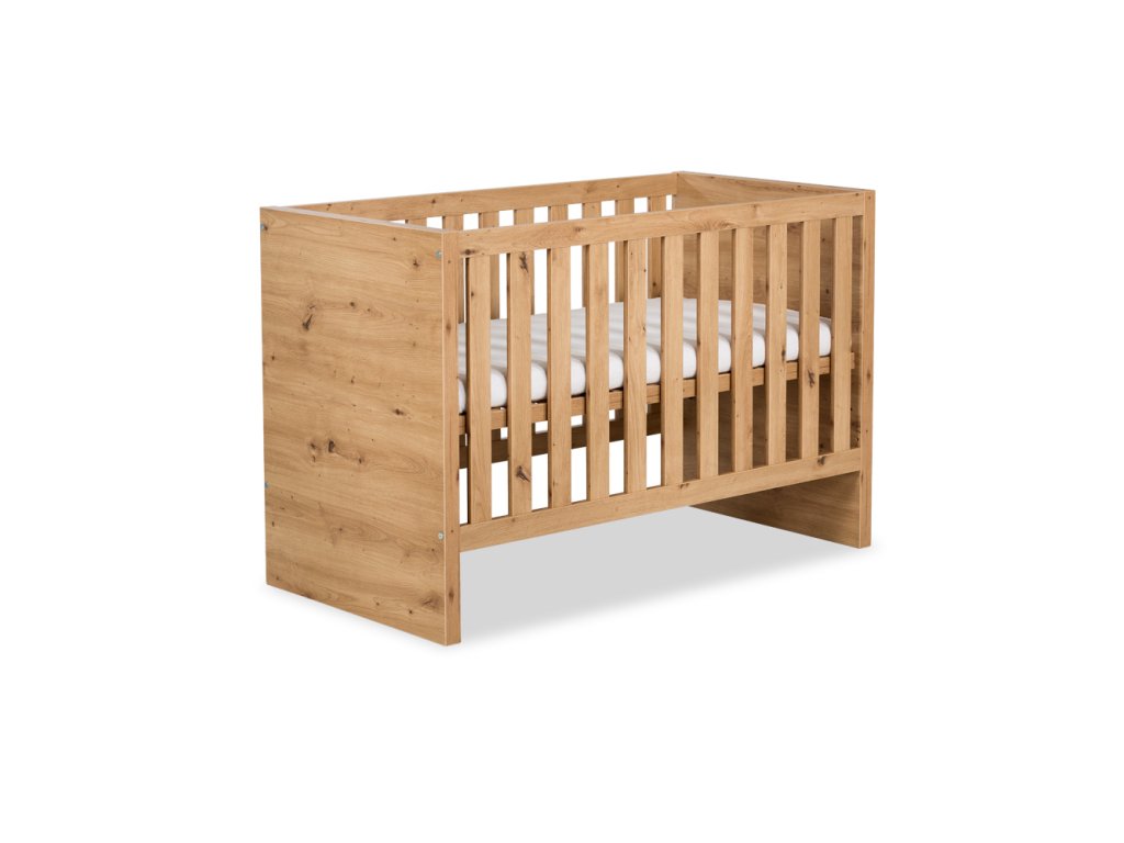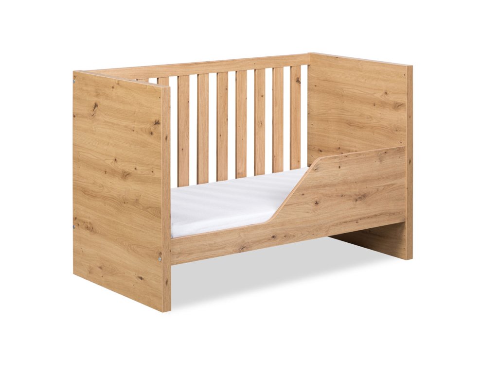 Dětská postýlka v barvě dubu v rozměru 120 x 60 cm.